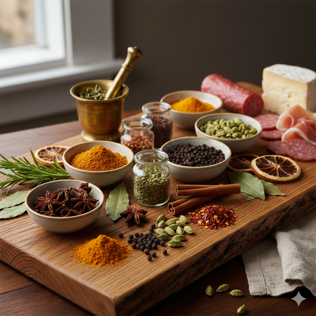 Perfiles Terrosos y Especiados: Comino, cúrcuma, nuez moscada, canela, clavo, cardamomo y jengibre.